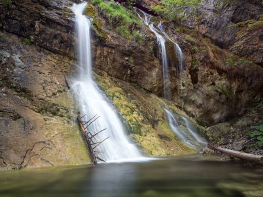 Od razcepa se spustimo do struge, jo prečkamo na levi breg in se vzpnemo po stezi nad vodo do naslednjega mostu. Za njim nas čaka še vzpon po krajši lestvi in že stojimo pred čudovitim četrtim slapom, visokim 17 metrov. Gre za najlepšega med slapovi, saj voda prosto pada v enem pramenu in se v široki pahljači razbije na štirimetrski dolomitni kopici sredi tolmuna. Steza mimo četrtega slapa poteka po desnem bregu in se vzpne nadenj, kjer preko mostu prečkamo ozek, 15 metrov globok kanjon, ki ga je urezala voda, poln kotličev in manjših slapov.